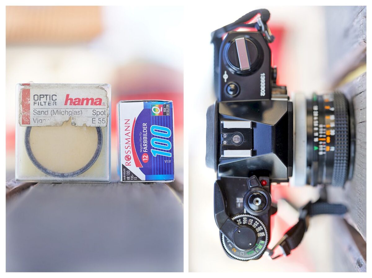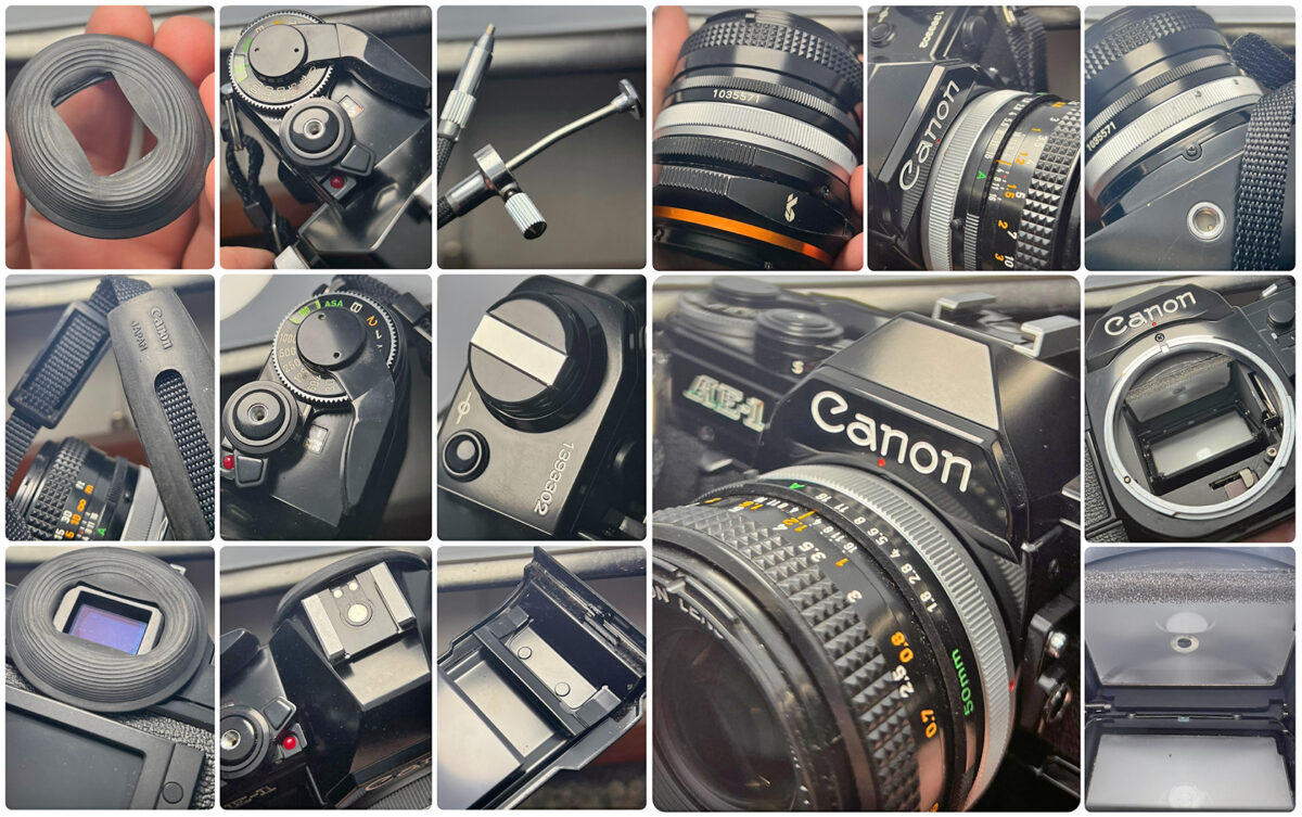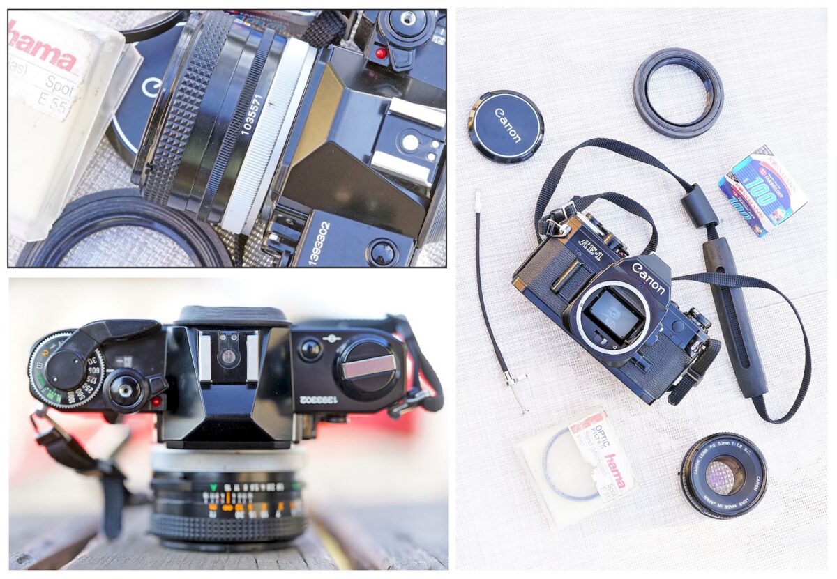 Tělo Canon AE-1 Black, objektiv Canon FD 50mm f/1.8 S.C., originální přední krytka Canon