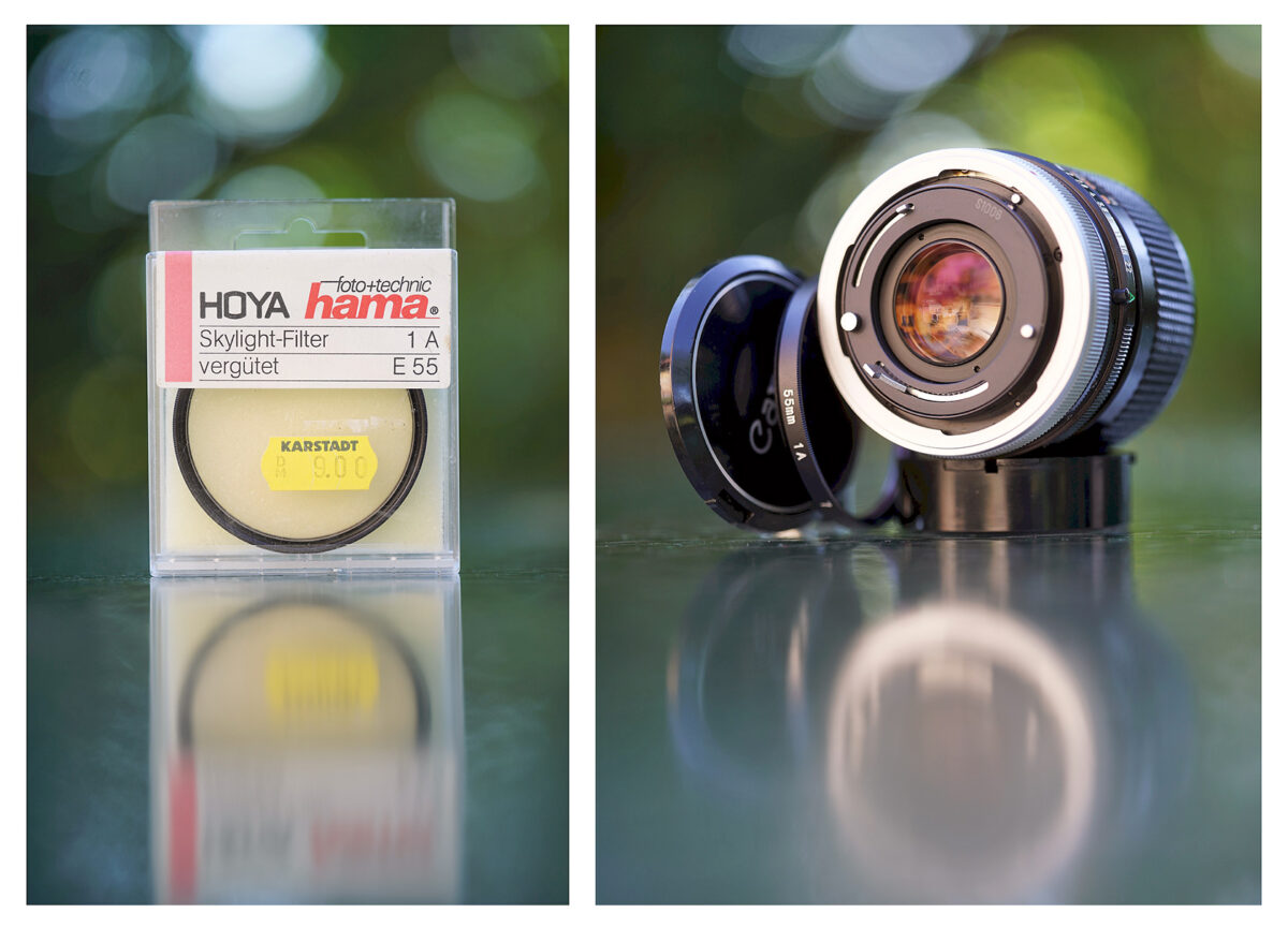 Ochranný filtr Hama Sky 1A E55 (včetně originální krabičky), který doporučuji ponechat na objektivu pro ochranu předního členu.