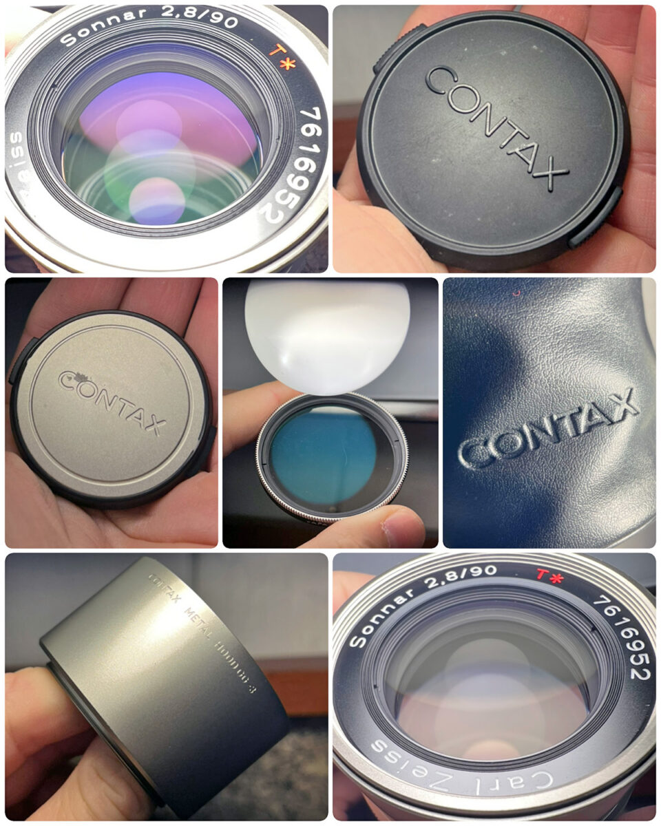 ▢ OBSAH NABÍDKY: Objektiv Carl Zeiss Sonnar 90mm f/2.8 T*, kovová sluneční clona GG-3, filtr B+W, přední a zadní krytka, originální kožený pytlík.