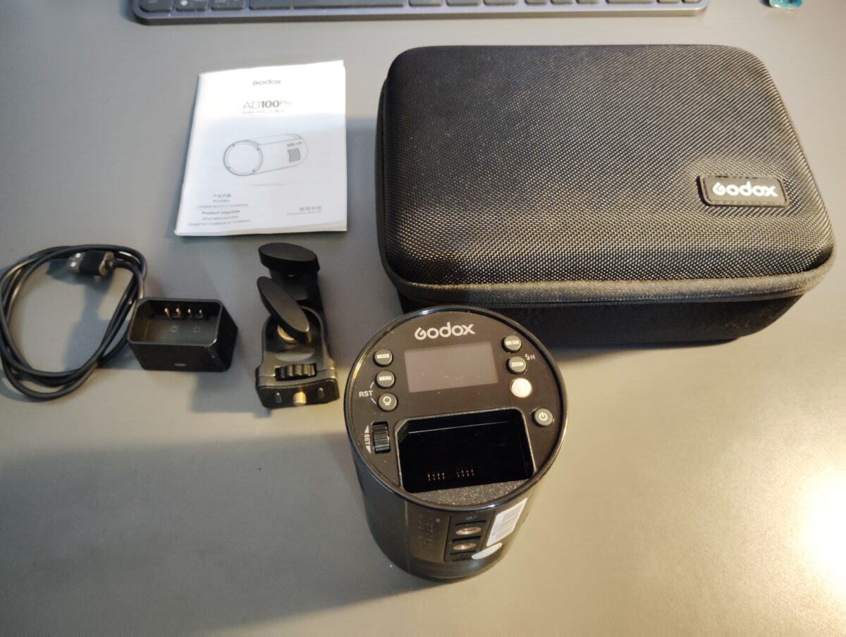 Godox AD100pro (blesk, baterie, nabíječka, USB kabel, držák na stativ, přepravní pouzdro).