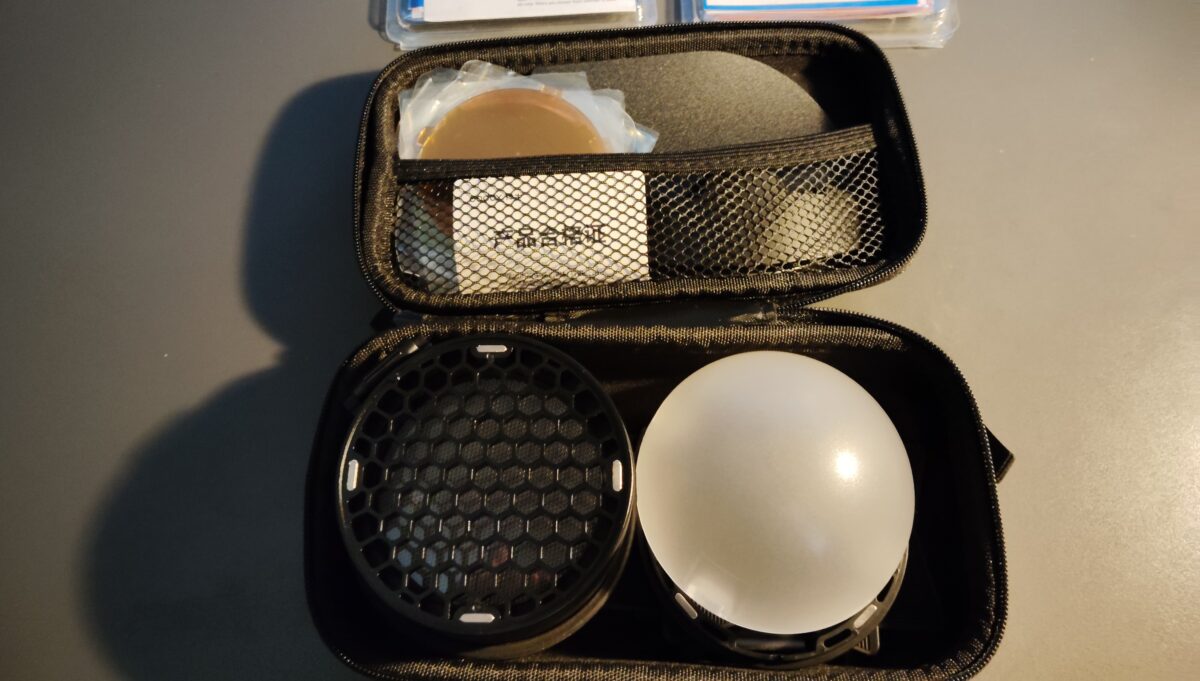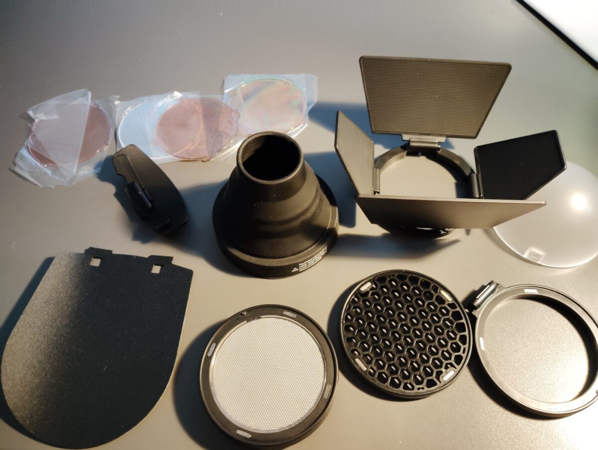 Sada AK-R1 (magnetické klapky, komínek/snoot, polokulovitý difuzor, odrazná destička, medová plástev a sada barevných filtrů v pouzdře).