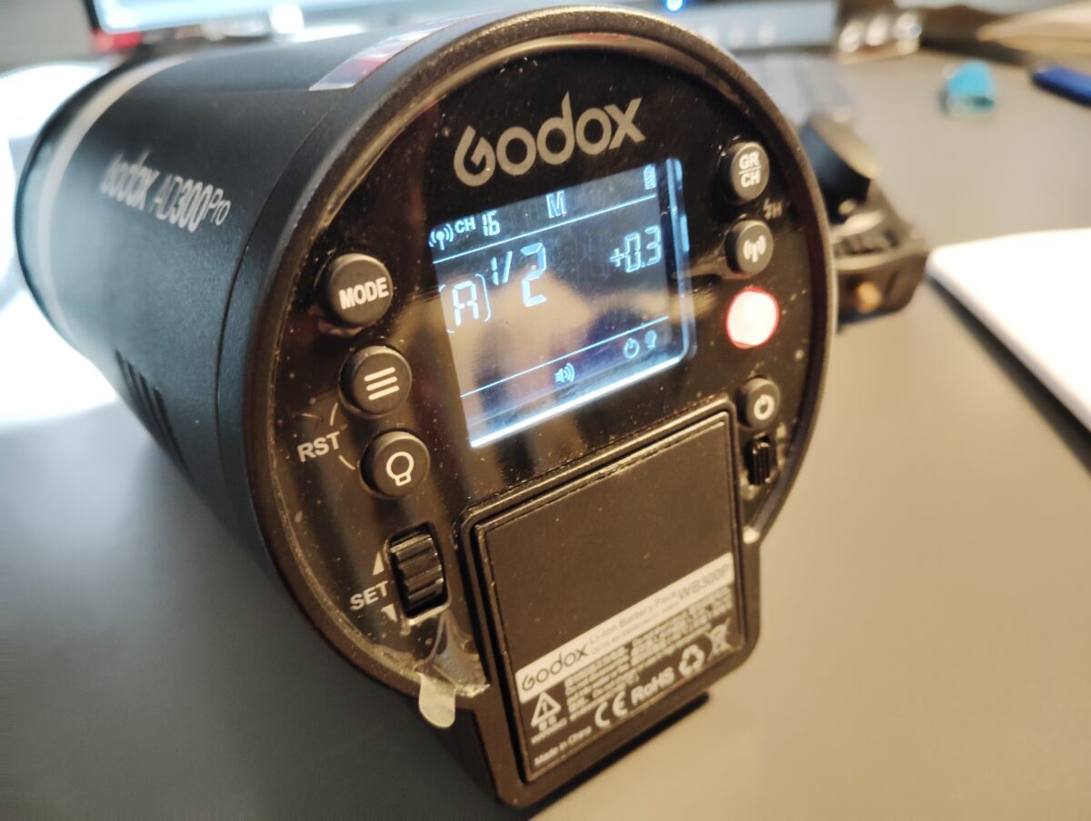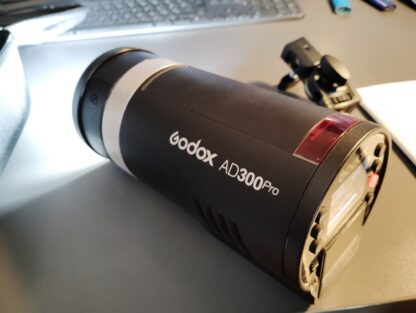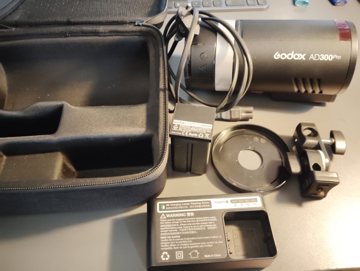 Godox AD300pro (blesk, výbojka, baterie, nabíječka, držák na stativ AD-E2, skleněný kryt výbojky, brašna).