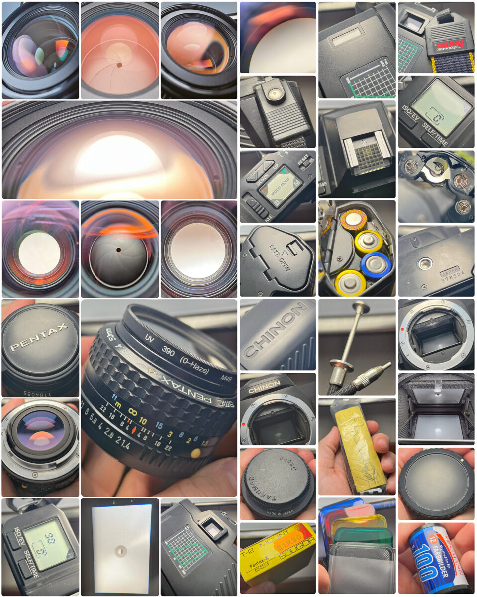 Kinofilm Chinon CP-7M Multi-Program + SMC Pentax-A 50mm f/1.4, PK/A, Brašna, Konvolut