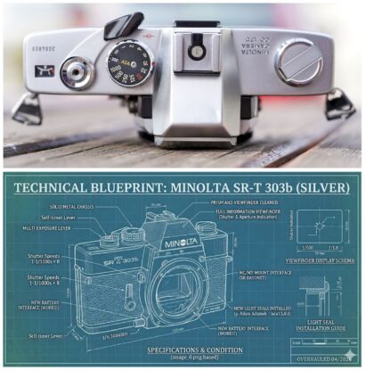 Kinofilm Minolta SR-T 303b (stříbrný) – repas 2026, sbírkový stav, pouzdro, nové baterie, bajonet MD/SR