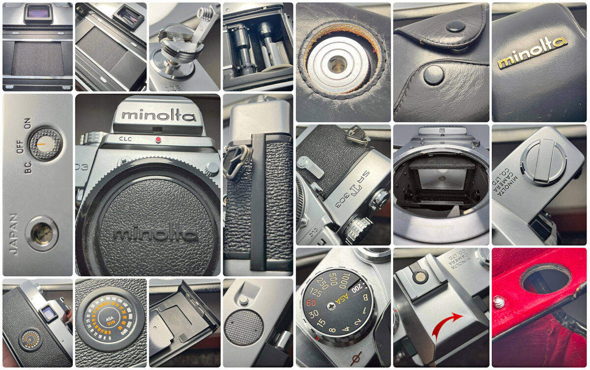 Celkový stav hodnotím jako sbírkový (VG/Excellent). Hranol a matnice jsou velice čisté, hledáček jasný. Jedinou nalezenou kosmetickou vadou je drobný ťukanec na hlavě aparátu (označeno červenou šipkou na kolážích), jde o bagatelní záležitost bez vlivu na funkci. Robustní celokovové šasi.