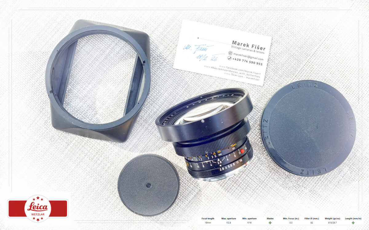 Leica Elmarit R 19mm f/2.8 (3-Cam 1981) – stav Near Mint, éra Midland Canada