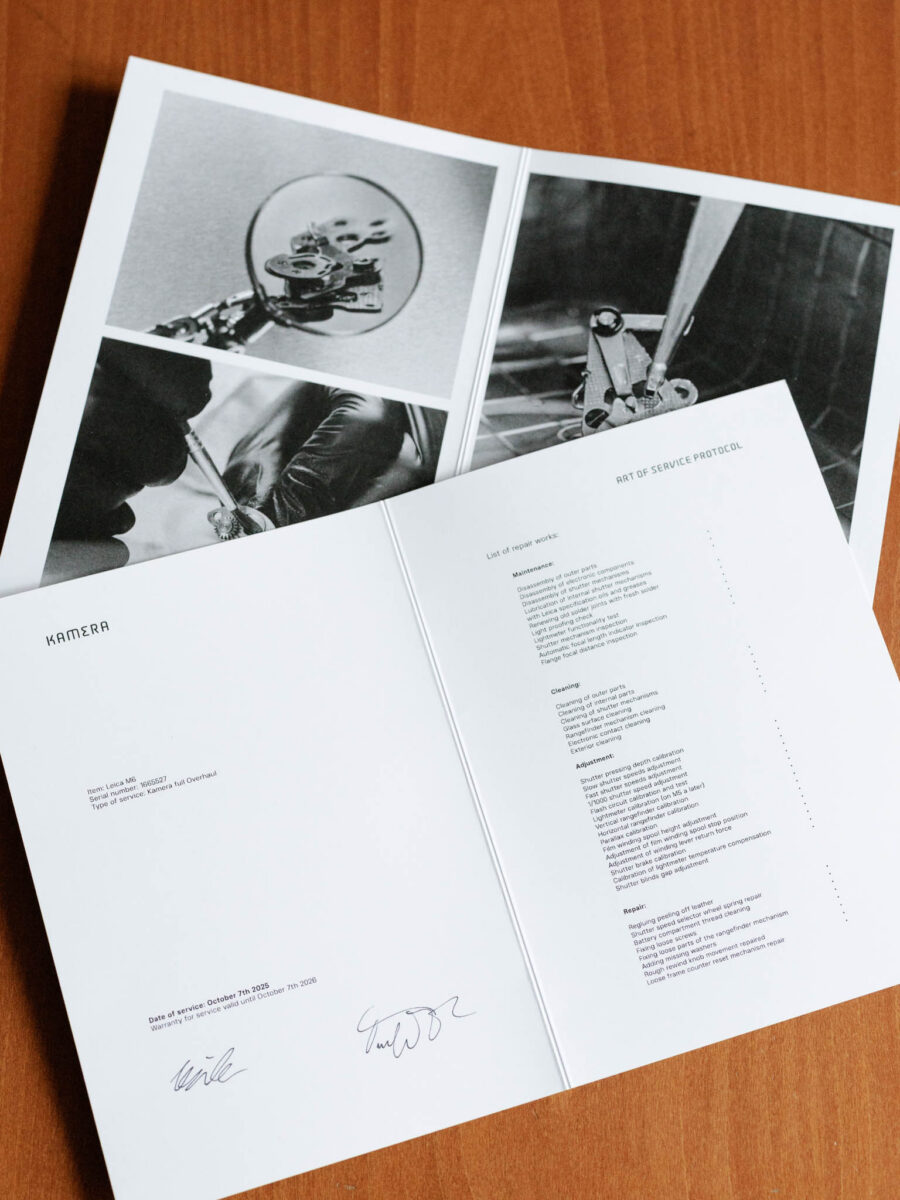 Kamera je po kompletním servisu v říjnu 2025 (CLA). Vše tedy funguje perfektně, včetně přesného expozimetru, korektních časů závěrky, nově lubrikovaných ovládacích prvků apod.