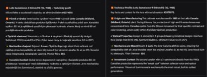 ⚙️ Technický popis: Tento konkrétní kus (№3379575) byl vyroben v roce 1985 v závodě Leitz Canada. Optika je bez jakýchkoli závad i pod silnou lampou – čistá bez plísní, mlhy či mikroškrábanců, bez nežádoucích stop na antireflexu.