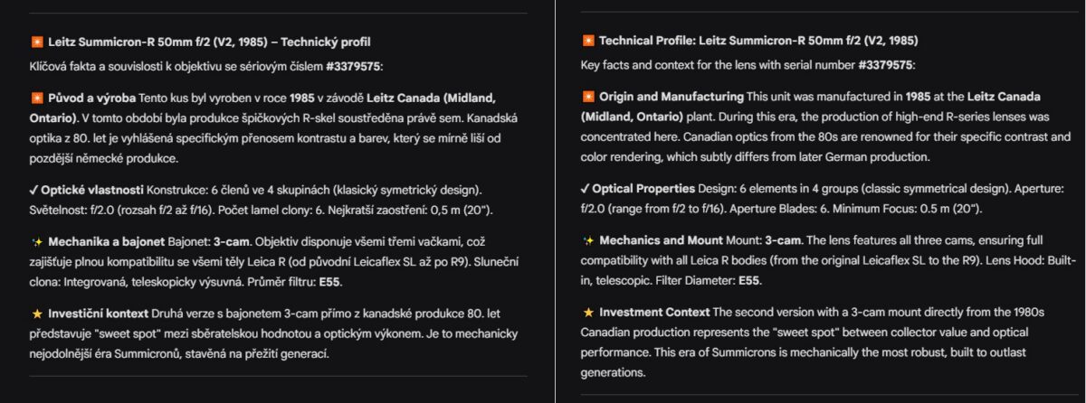 🍁 Éra Midland Canada: Tento Summicron pochází ze zlaté éry kanadského Midlandu, kdy tamní produkci vedl legendární optický designér Dr. Walter Mandler. Kanadské objektivy z 80. let jsou proslulé svým specifickým mikrokontrastem a barevným podáním, které mnozí fotografové upřednostňují.