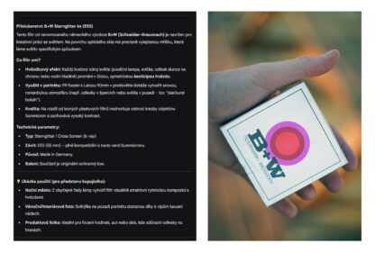 Filtr B+W E55 Sterngitter 6x (Cross Screen): efektový filtr od prestižního německého výrobce B+W. Z bodových zdrojů světla a odlesků vytváří efektní šesticípé hvězdy – ideální pro kreativní noční scény nebo portréty v protisvětle. Včetně originálního boxu.