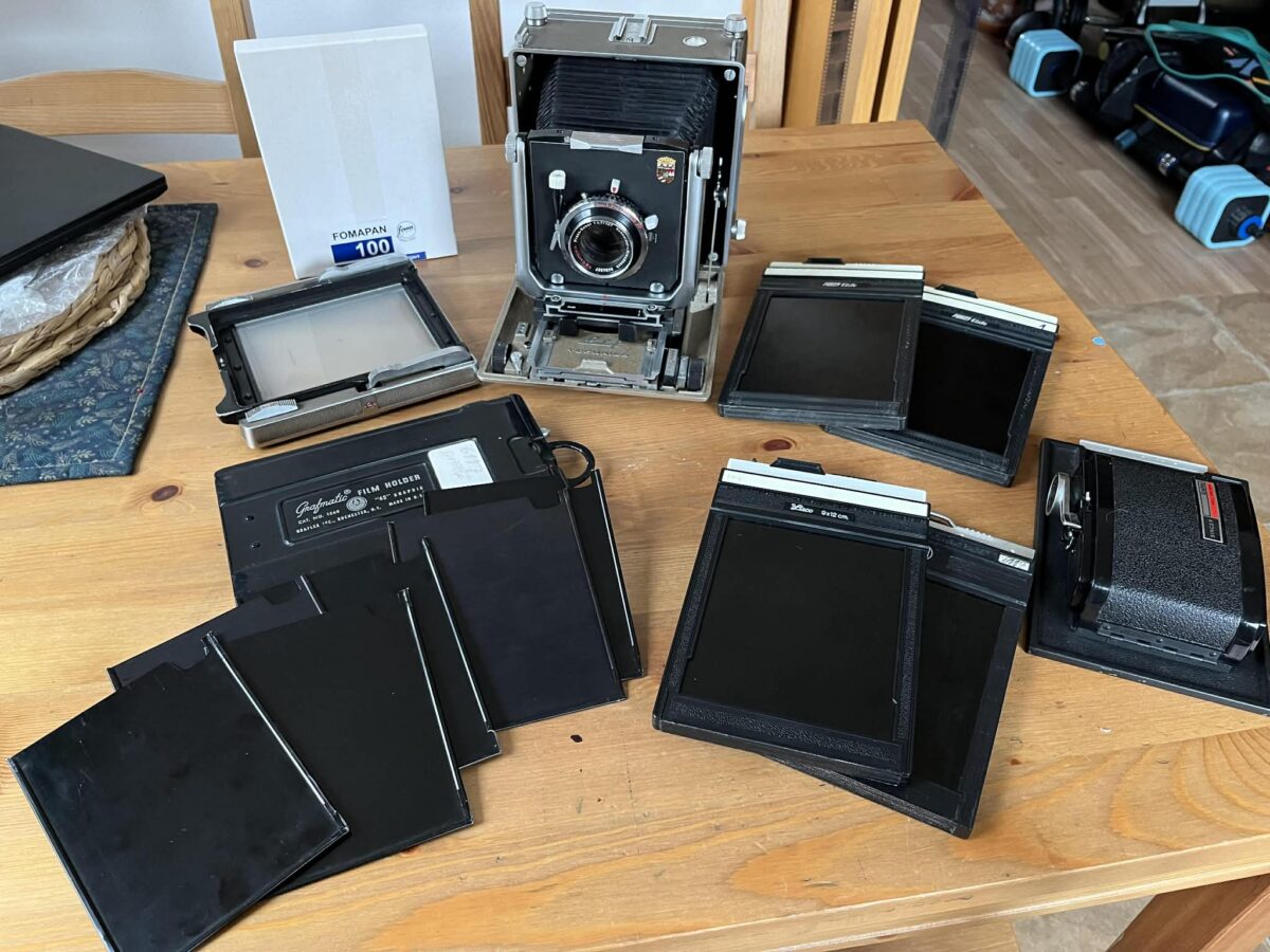 Všechny pohyby jsou bezproblémové. Součástí je Objektiv Press- Xenar 127mm f/4.7. Skla čistá bez plísně a prachu. Závěrka funguje přesně. K tomu kazeta Grafmatic na 6 planfilmů. Součástí je 6 desek. 2x kazeta na 9x12 film a 2x kazeta na 4x5 film. Balíček filmů 4x5 Fomapan 100. Roll kazeta Graflex Singer 6x7, 2x matnice, 2x objektivová destička Linhof, vyvolávací tank na 4x5 filmy. Součástí je i odmontovaný dálkoměr, který lze znovu připojit.
