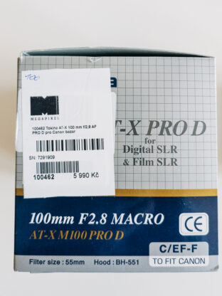 Prodám makro objektiv Tokina AT-X 100mm f/2.8 PRO D s bajonetem Canon EF. Je v perfektním stavu. Koupil jsem ho v bazaru Megapixelu s roční zárukou (ta už vypršela), ale fotil jsem s ním asi jen 3x. Teď leží doma v šuplíku. Kompletní balení s krytkami, krabicí a sluneční clonou.