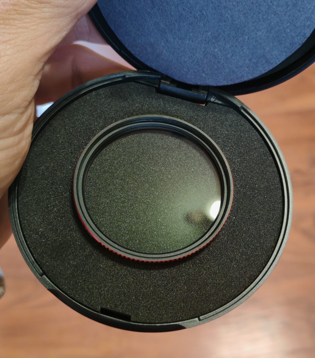 Parádní UV filtr s červenou obroučkou.