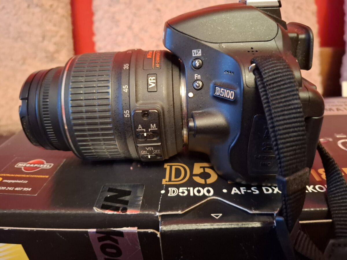 Nabízím digitální zrcadlovku Nikon D5100 včetně základního objektivu Nikon 18–55 mm f/3,5–5,6 G AF-P DX VR. Fotoaparát byl málo používaný, je ve velmi dobrém stavu a plně funkční.