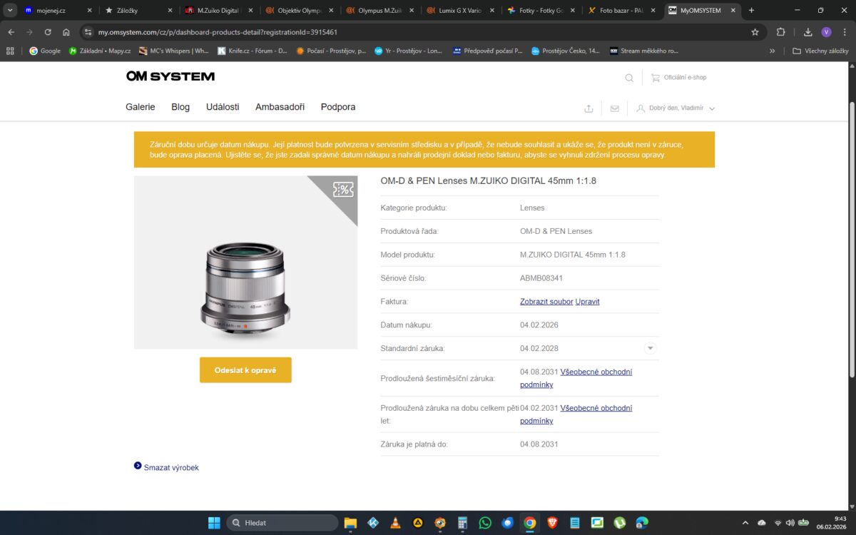 zakoupený 4.2.2026, záruka do 4.8.2031 viz doklad.