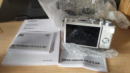 Fotoaparát je v bílo-stříbrné barvě. Objektivy 14–42 mm a 40–150 mm jsou stříbrné.