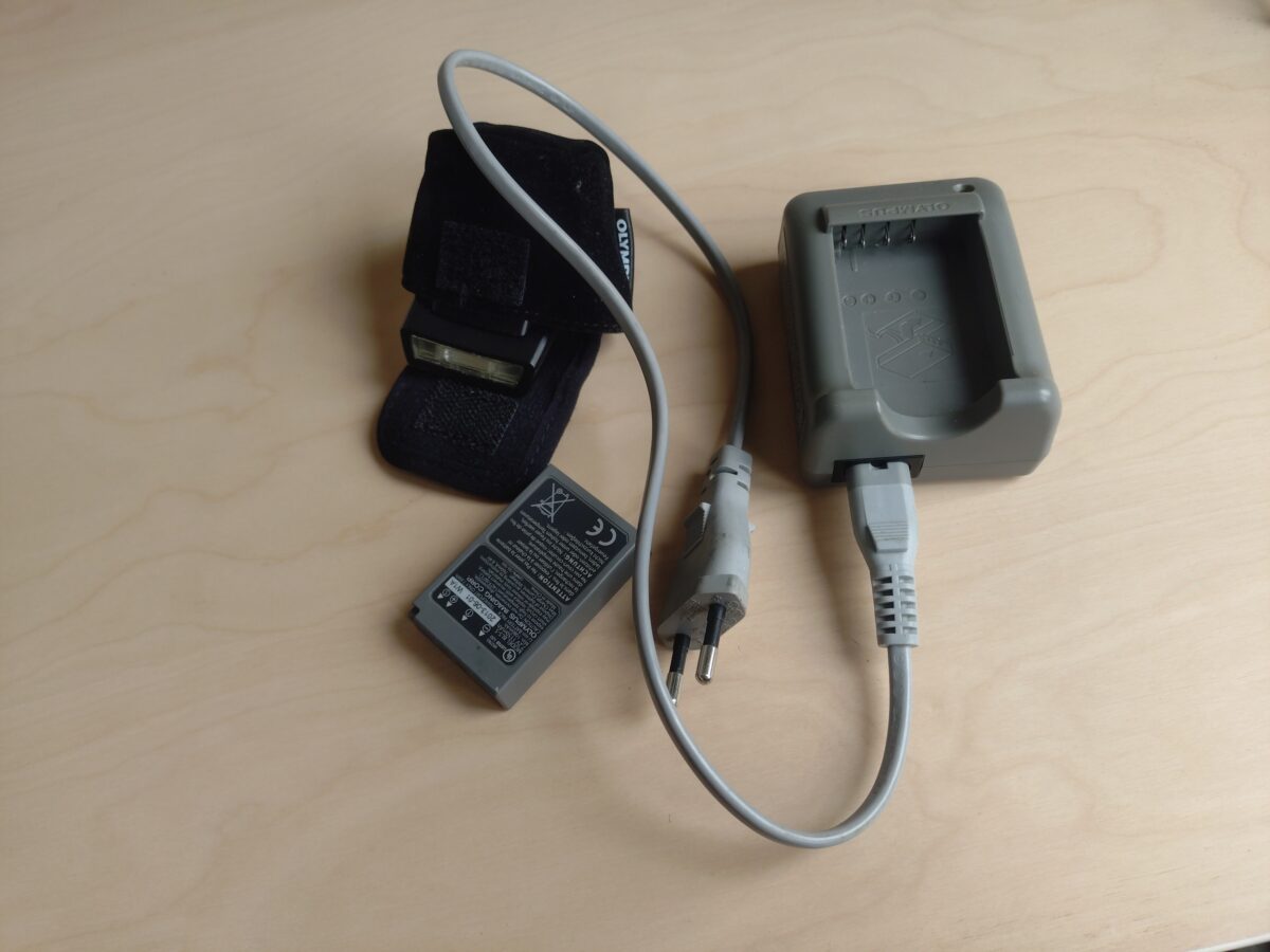 Součástí blesk, nabíječka náhradní baterie, mohu přidat i popruh, ale mě se osvědčil wrist strap co je na něm teď.
