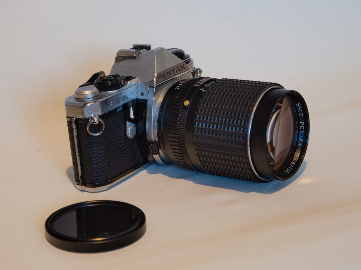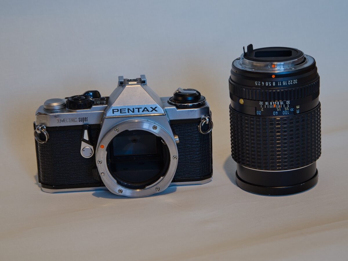 Prodám kinofilmovou zrcadlovku Pentax ME Super včetně světelného objektivu SMC Pentax 2,5/135. Na těle lehké známky používání, ale měření přesné. Více informací mailem.