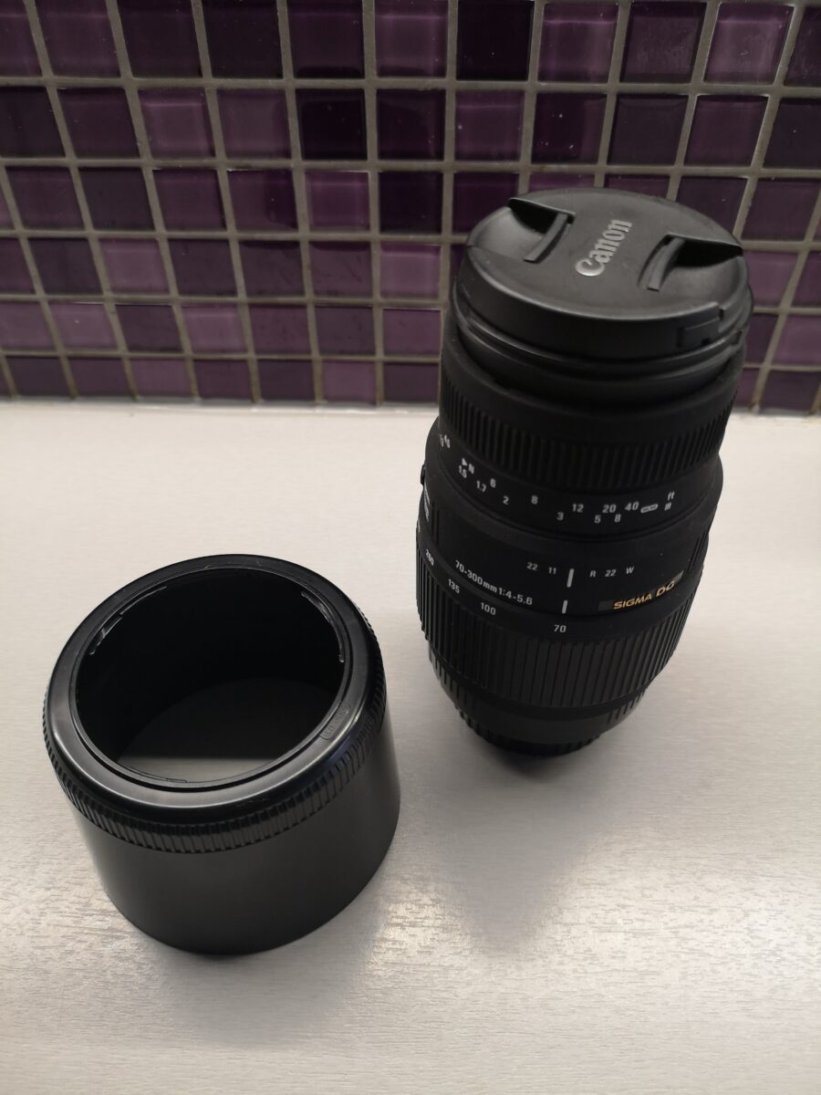 Prodám teleobjektiv Sigma 70-300 mm f/4-5.6 DG Macro pro Canon EF. Objektiv je ve velmi dobrém stavu, má pouze minimální známky používání a je zcela funkční.