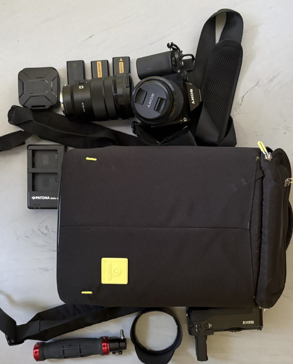 Ramení popruh,setový objektiv 28-70, G objektiv Sony 18-105 f4 pro APS-C,sluneční clona,3 ks. Baterie,battery grip,duální nabíječka,stativové madlo,tough krabička na sd karty, foto batoh Vanguard