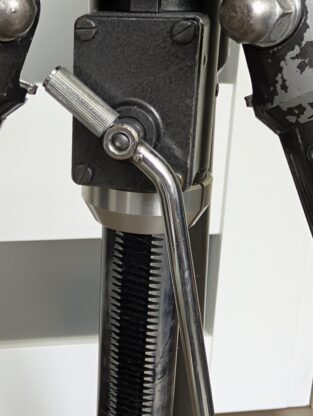 Původní, vzácně zachovalý stav i s originálním klepítkovým nátěrem, který je často nenávratně fuč. Byl kompletně rozebrán a provedeno seřízení a namazání. Některé nýtky už nejsou co bývaly, ale funkčně nemá stativ jakýkoli problém. Nese stopy užívání a drobné chyby, ale velmi pravděpodobně nás všechny přežije. Unese naprostej nesmysl, až pro velko-velko-formáty (a je patřičně těžkej). Středová tyč se dá navíc korigovat táhlem. Včetně originální třícestné hlavy s krásně plynulým pohybem a velmi velkou plochou, což se extra hodí na těžké velkoformáty. Podařilo se mi sehnat i originální středový šroub.