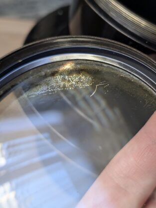 Přední i zadní čočka jsou jen s minimálními stopami po čištění či čemkoli dalším. Jediný defekt je okružní separace zadního členu, což však nebude mít na fotku žádný vliv, neboť je jen po krajích. Sklo se dá zpětně ztmelit, pak bude optika celého objektivu blízka novému. Šasi je v hezkém stavu, vše jde krásně rozebrat. Příruba není součástí.