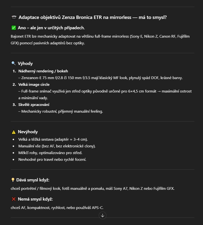 Adaptace na digitál: vyšší dívčí, ale teoreticky proveditelný (vizte obr. č. 3). Čipy moderních bezzrcadlovek zde budou pracovat se super ostrým středem optiky. Zajímavé pro perfekcionisty a všelijaké adaptační geeky. Adaptéry v zahraničí existují, ale jsou drahé.
