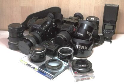 Nabízím sestavu Pentax 645N + 645D + 5 objektivu FA. Ke všem pol. filtry a clony. Zásobní vozík pro film s krabičkou. Mezikroužky makro, pro osazení oběktivy od…