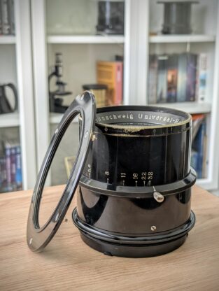 Nejúspěšnější soft-focus/piktorialistický objektiv historie, zde ve vzácné a nejdelší variantě 460mm. Pokryv je na plnou díru alespoň 24x30cm, při použití jen zadního elementu stoupne ohnisko na přibližně 760mm…